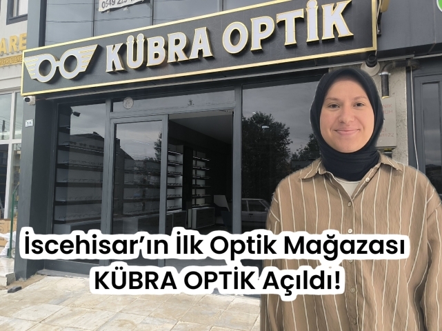 İscehisar’ın İlk Optik Mağazası KÜBRA OPTİK Açıldı!İscehisar’da bir ilk gerçekleşti! Göz sağlığınız ve şıklığınız için ihtiyaç duyduğunuz her şey artık çok daha yakınınızda… KÜBRA OPTİK, İscehisar’da kapılarını açarak ilçeye yepyeni bir hizmet alanı kazandırdı.İscehisar’ın ilk optik gözlükçüsü unvanını taşıyan KÜBRA OPTİK, optisyen Kübra Kalkan Uğur yönetiminde hizmet veriyor. Mağazada;
